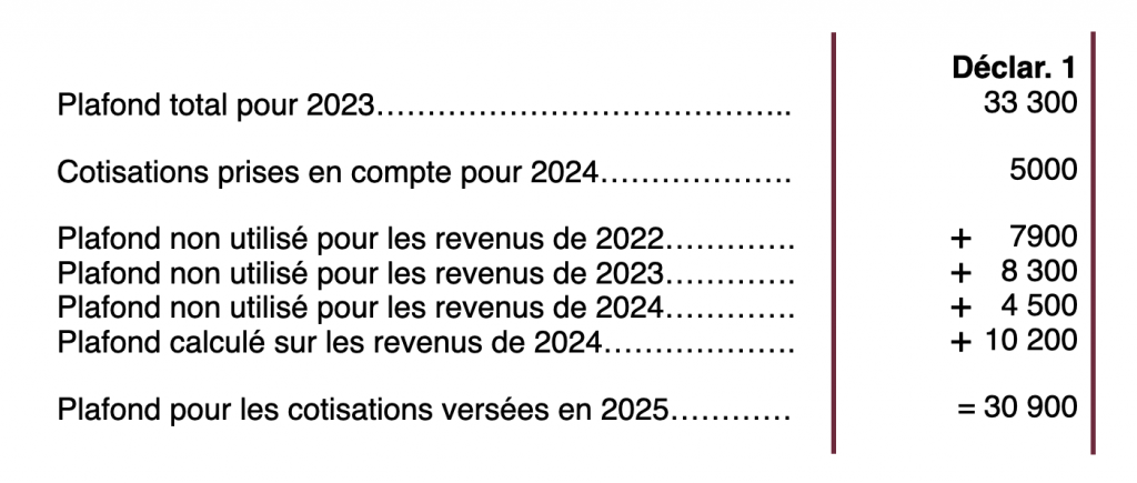 Plusieurs montants sont mentionnés car ce plafond est calculé chaque année. Il est « utilisable » pendant 4 ans. Ainsi, pour connaître le montant à verser et obtenir la déduction des revenus maximale, vous devez regarder la ligne « Plafond pour les cotisations versées en 2025 ». Si vous souhaitez verser moins, vous allez consommer en priorité le « plafond sur revenus 2024 », puis 2022 et 2023 ! Attention aux dates de « péremption » de ces plafonds pour les utiliser au mieux.
