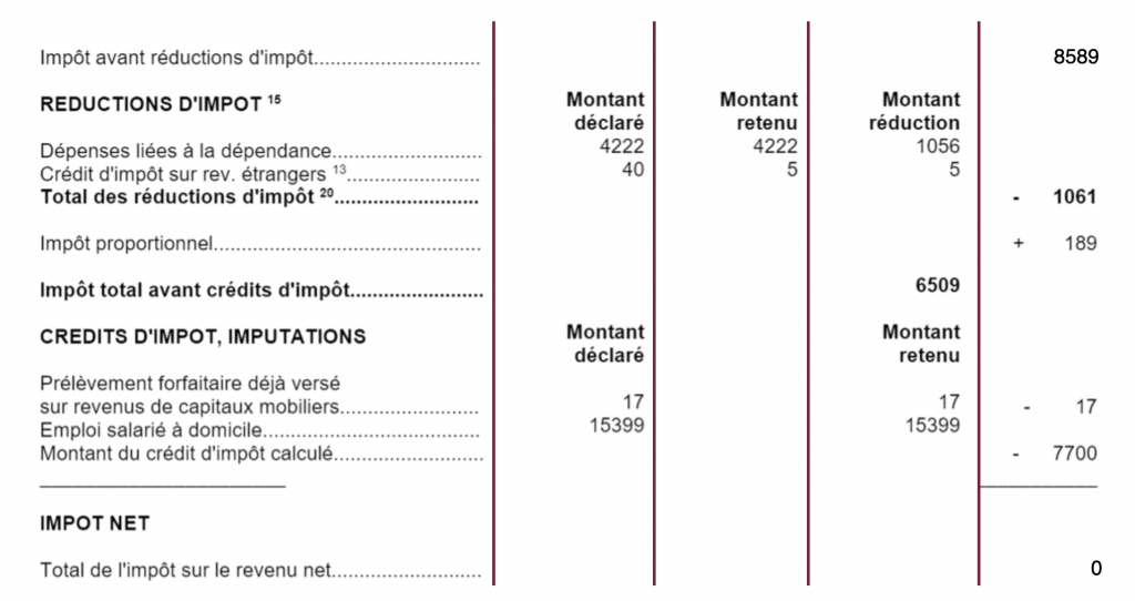 Une ligne mentionne votre impôt NET, c’est-à-dire après imputation des réductions et crédits d’impôt. Ces avantages sont limités par le plafonnement global des niches fiscales : vous ne pouvez pas bénéficier de plus de 10 000 € par an de gain fiscal via des crédits ou réductions d’impôt. Votre impôt sera donc diminué dans cette limite maximale ; les avantages « excédentaires » seront généralement perdus.