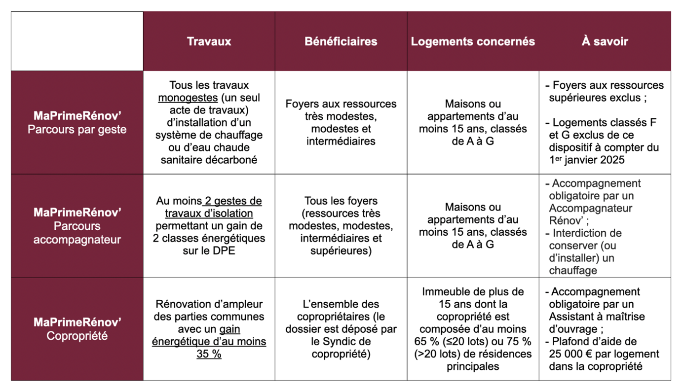 MaPrimeRénov’ se décline en 3 volets : MaPrimeRénov’ Parcours par geste, MaPrimeRénov’ Rénovation d’ampleur (aussi appelé Parcours accompagné ou parcours accompagnateur) et MaPrimeRénov’ Copropriété.
